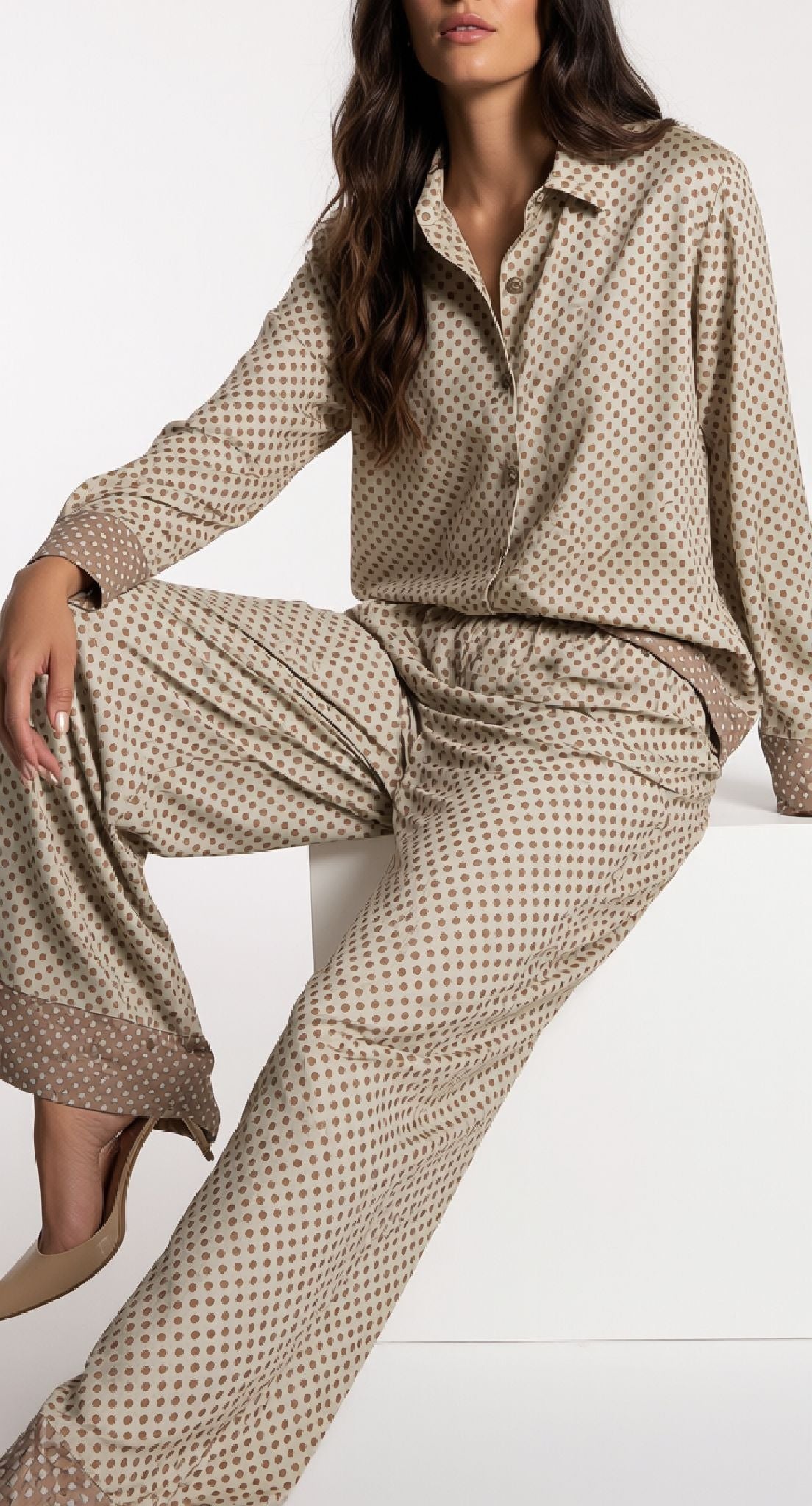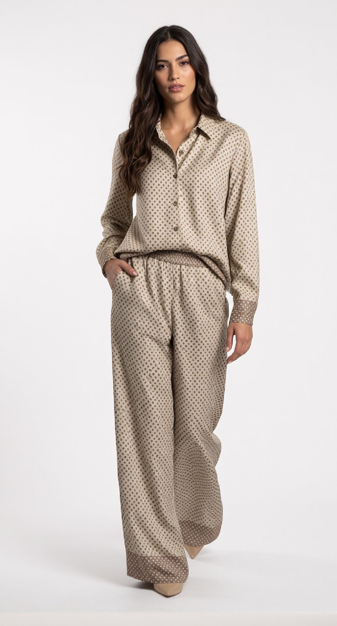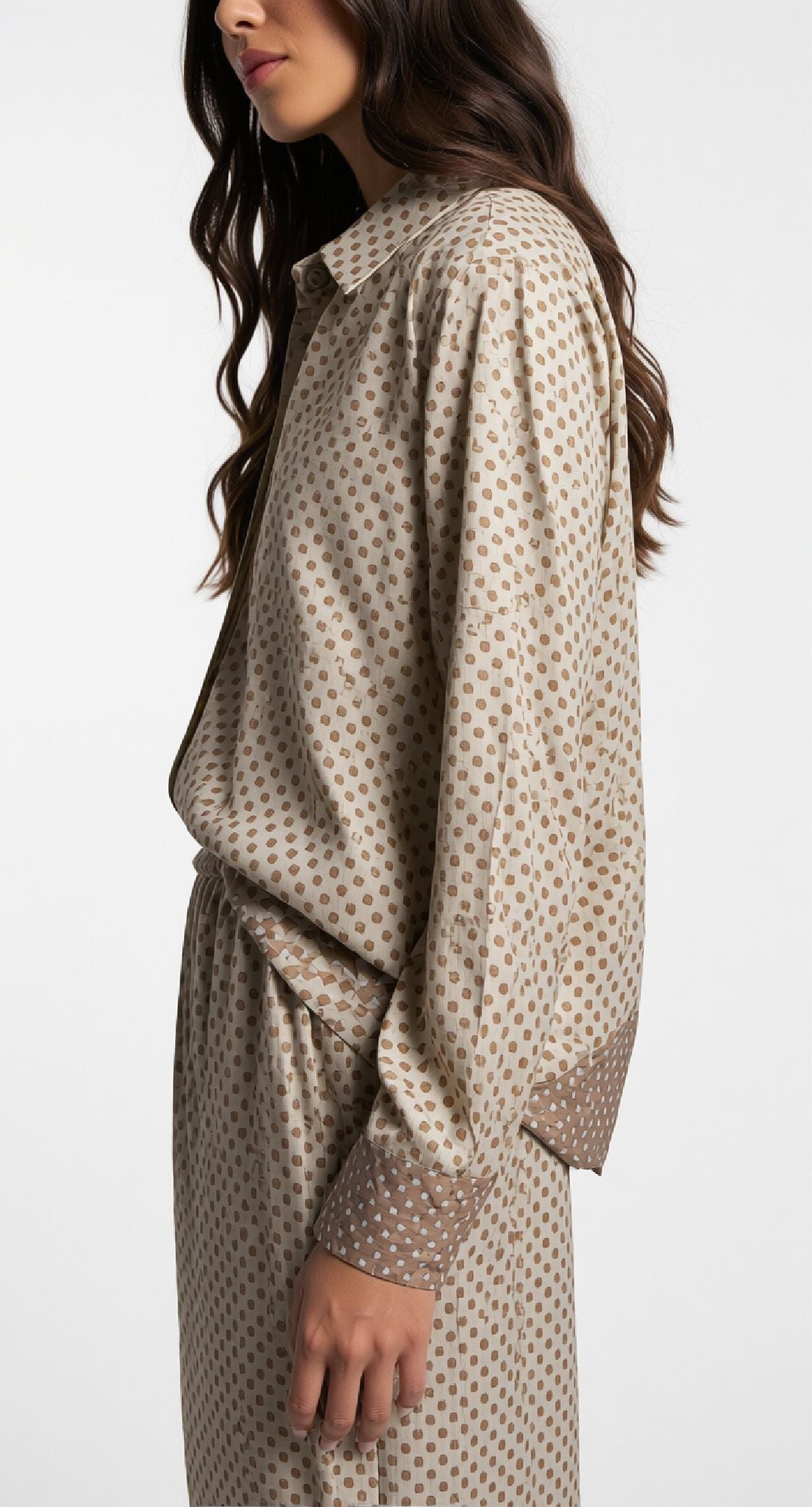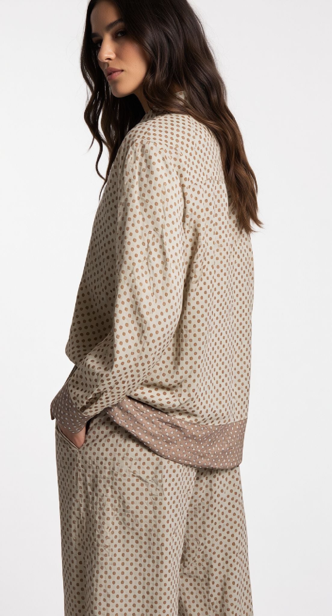 Camicia elegante con motivo a pois, perfetta per chi ama uno stile classico e versatile. Il design a pois aggiunge un tocco di personalità a qualsiasi outfit, rendendola ideale sia per occasioni casual che semi-formali. Realizzata con attenzione ai dettagli, questa camicia si abbina facilmente con pantaloni o gonne, garantendo comfort e praticità durante la giornata. Un capo essenziale per chi desidera un guardaroba raffinato e senza tempo.