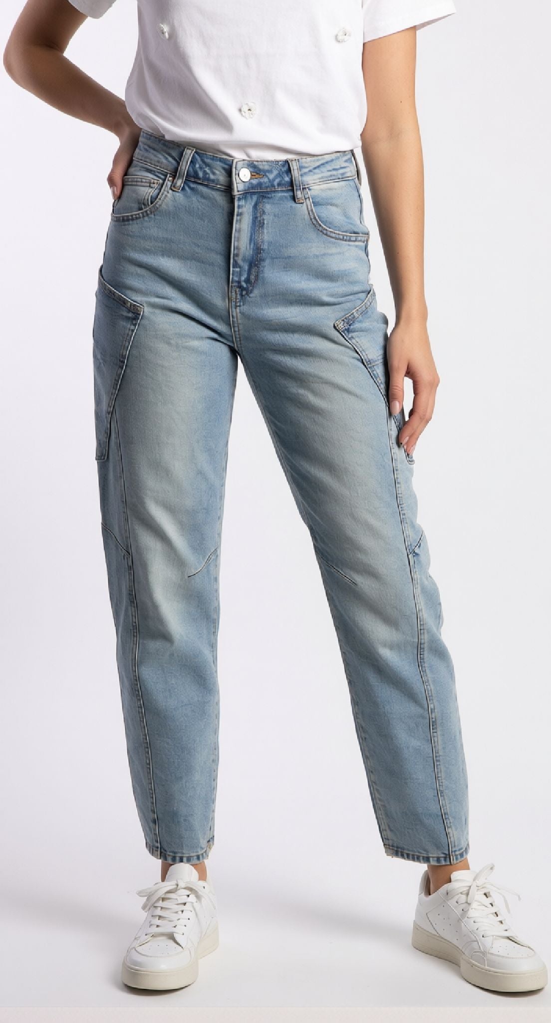 Jeans a vita alta con silhouette balloon che regala comfort e stile. Il trattamento sabbiato conferisce una texture vintage e un aspetto vissuto, perfetto per chi ama i dettagli ricercati. La vestibilità ampia nella zona coscia si affina verso la caviglia, creando una linea moderna e affascinante. Ideale per outfit casual chic che mixano comodità e personalità.